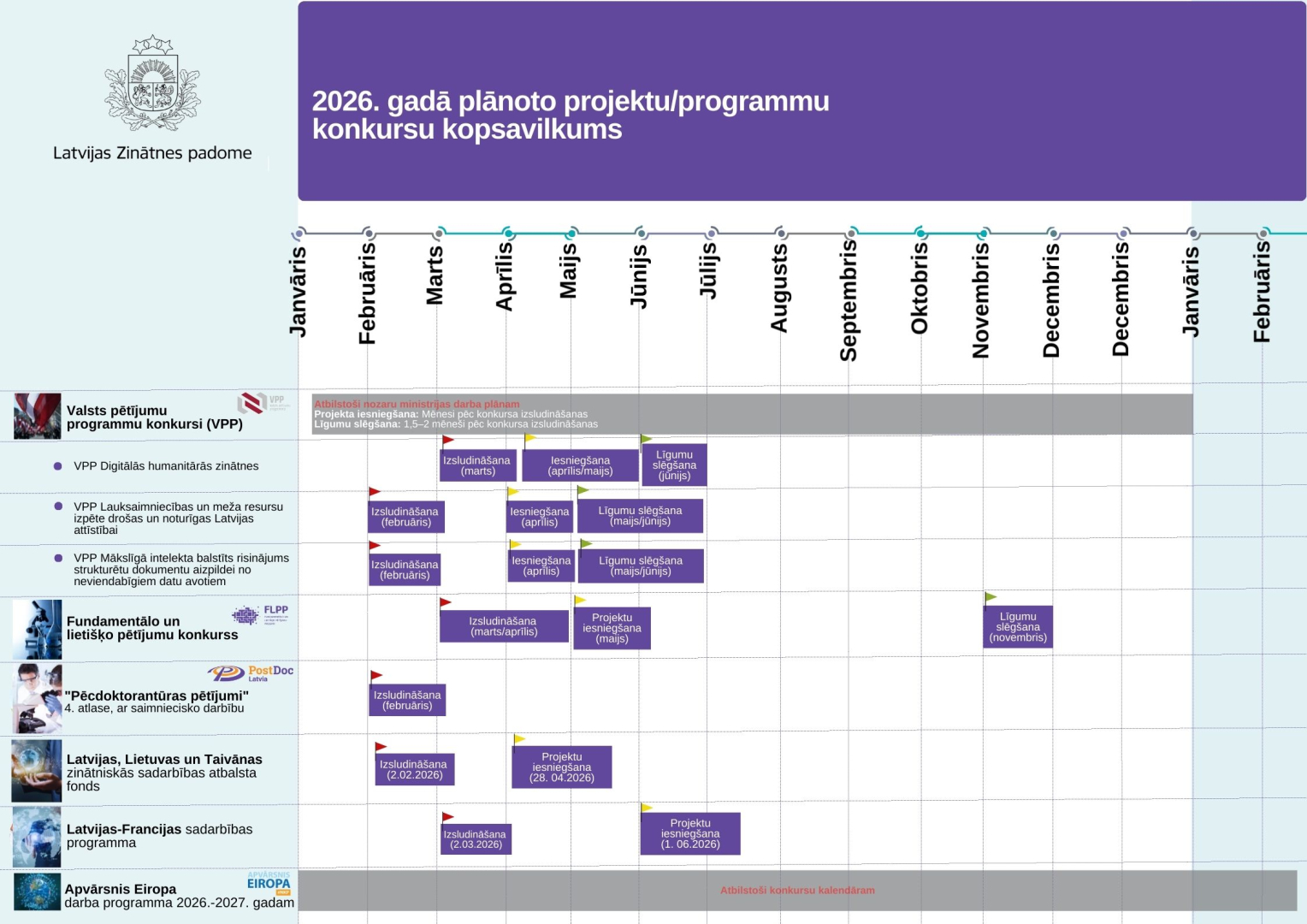 - VPP “Digitālās humanitārās zinātnes” (Izglītības un zinātnes ministrija) – izsludināšana 2026. gada martā, projektu iesniegšana aprīlī–maijā, līgumu slēgšana jūnijā;