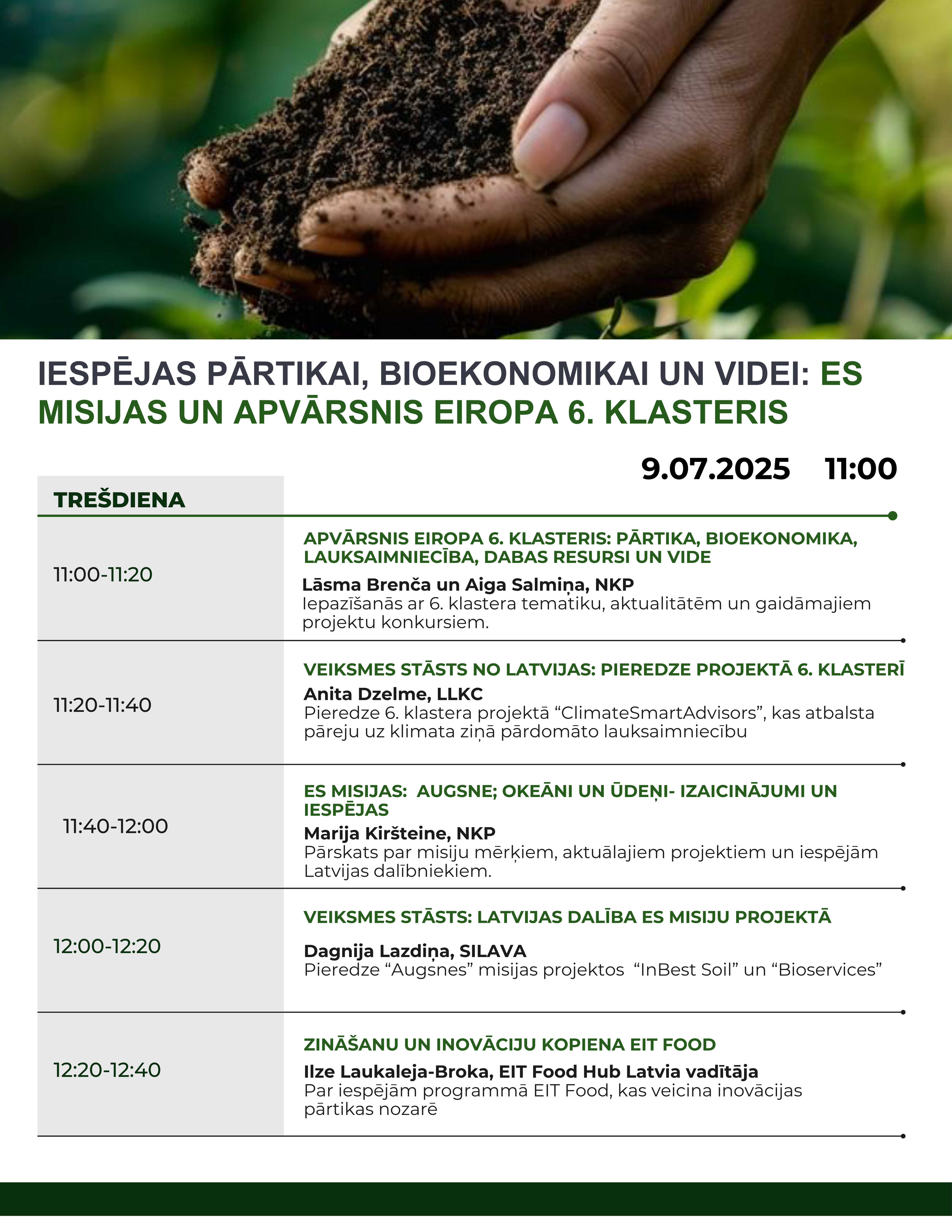 Pasākumā būs iespēja iepazīties ar "Apvārsnis Eiropa" 6. klastera iespējām un aktualitātēm, uzzināt vairāk par ES Misijām, kā arī par EIT Food.