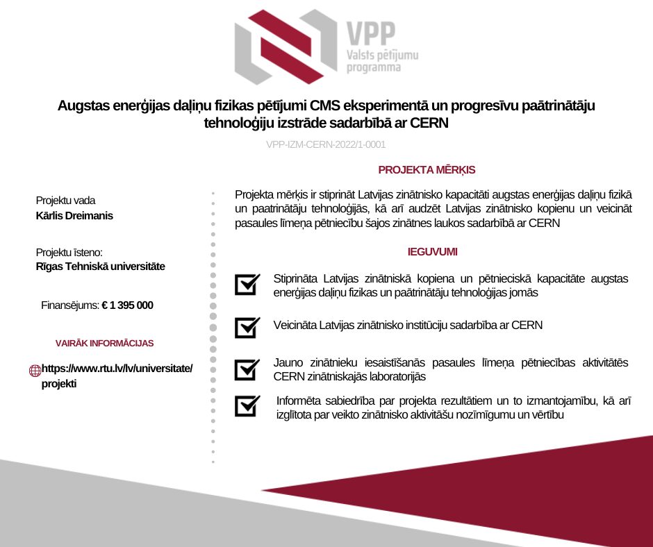 Projekta virsmērķis ir turpināt stiprināt Latvijas zinātnisko kopienu un pētniecisko kapacitāti augstas enerģijas daļiņu fizikas un paātrinātāju tehnoloģiju jomās, kā arī veicināt Latvijas zinātnisko institūciju sadarbību ar CERN. Projekta ietvaros, sadarbojoties Rīgas Tehniskajai universitātei, Latvijas Universitātei un Latvijas Universitātes Cietvielu Fizikas Institūtam, tiks veikta pētniecība fundamentālajā daļiņu fizikā Kompaktā Mionu Solenoīda (CMS) eksperimentā CERN, galvenokārt, fokusējoties uz Top kvarka fizikas mērījumiem un MIP Timing Detector (MTD) apakšdetektora sistēmas izstrādi. Līdztekus augstas enerģijas fizikai, projekta pētnieku grupa turpinās zinātnisko iesaisti vairākos CERN paātrinātāju tehnoloģiju izpētes projektos, tajā skaitā projektos, kuru pētnieciskie rezultāti ir ar augstu atdevi sabiedrībai. Projekta laikā Latvijas jaunie zinātnieki, doktoranti un maģistranti iegūs iespēju veikt pasaules klases pētnieciskās aktivitātes daļiņu fizikā un progresīvu paātrinātāju tehnoloģiju attīstīšanā, sadarbojoties ar pasaulē vadošajiem pētniekiem attiecīgajās zinātnes jomās. Projekta gaitā liels uzsvars tiks likts arī uz sabiedrības informēšanu un izglītošanu par veikto zinātnisko aktivitāšu nozīmīgumu un vērtību.