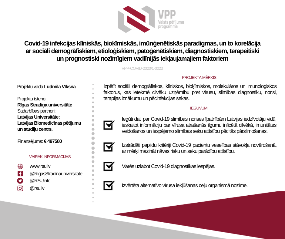 Pētījuma mērķis ir izpētīt sociāli demogrāfiskos, klīniskos, bioķīmiskos, molekulāros un imunoloģiskos faktorus, kas ietekmē cilvēku uzņēmību pret vīrusu, slimības diagnostiku, norisi, terapijas iznākumu un pēcinfekcijas sekas. Pētījumā ir plānots iesaistīt pacientus ar COVID-19 slimību dažādās smaguma pakāpēs un cilvēkus ar asimptomātisku SARS-CoV-2 infekciju. Iegūtie dati par jaunās infekcijas norises īpatnībām Latvijas iedzīvotāju vidū ir svarīgi, ņemot vēra infekciju slimībām raksturīgas atšķirības izplatības ātrumā un izpausmēs dažādās populācijās. Tie ļaus izstrādāt klīniskos algoritmus un vadlīnijas, uzlabot diagnostikas un ārstēšanas efektivitāti, samazināt nāves iznākuma risku. Projektā iegūtā informācija dos iespēju veikt salīdzinošo analīzi ar citu valstu pētījumiem par SARS-CoV-2 infekciju un palīdzēs pielāgot Pasaules Veselības Organizācijā izstrādātas rekomendācijas Latvijā