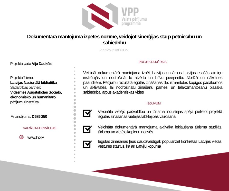 Projekta mērķis ir veicināt dokumentārā mantojuma izpēti Latvijas un ārpus Latvijas esošās atmiņu institūcijās un nodrošināt to atvērtu un brīvu pieejamību šībrīžā un nākotnes paaudzēm. Projekta pamatā ir jauns attiecību modelis starp dokumentārā mantojuma glabātājinstitūciju (Latvijas Nacionālā bibliotēka), universitāti (Vidzemes Augstskola) un mantojuma kopienām (vai šo kopienu pēctečiem, studējošajiem, u.c.). Projekta pētniecības tēmas apzināti ir izvēlētas tādas, kuras ir maz iepriekš pētītas, iesniedzoties vēstures periodā līdz par 13.gadsimtam, pievēršoties neērtām pētniecības tēmām un paceļoties pāri etniskajiem un valodas ierobežojumiem. Izvēlētās tēmas bagātinās vispārpieņemtās zināšanas Latvijas vēsturē un kultūrā, ienesot jaunus stāstus un to interpretācijas. Projekta rezultātā tiks veicināta vietējo pašvaldību un tūrisma industrijas spēja pielietot šīs zināšanas vietējās labklājības vairošanā un veicināt dokumentārā mantojuma aktīvāku iekļaušanu tūrisma studijās, tūrisma un vietējo kopienu norisēs, kā arī ļaus daudzveidīgāk popularizēt konkrētas Latvijas vietas un vēstures stāstus, kā arī Latviju kopumā.