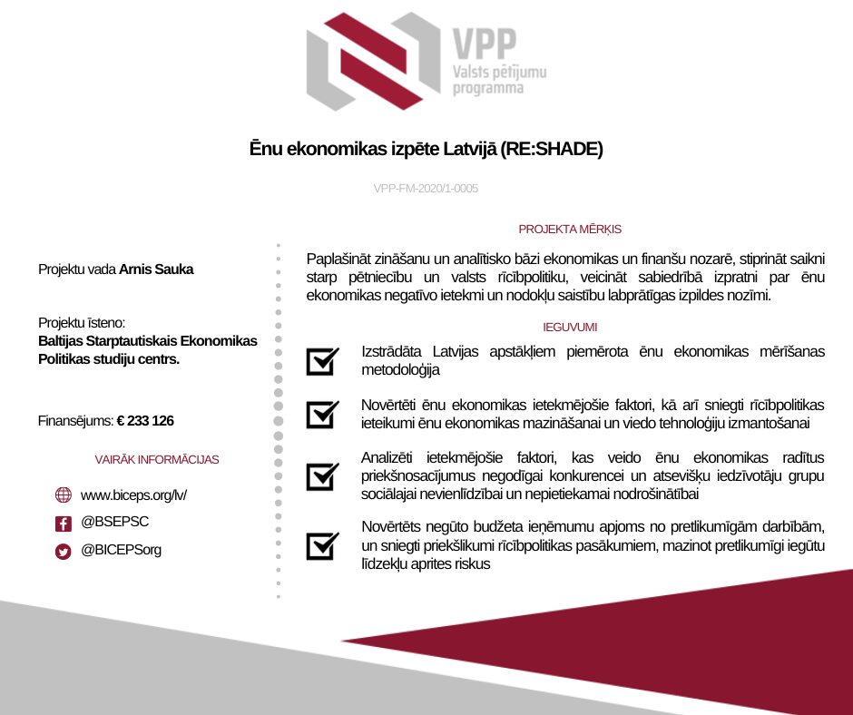 RE:SHADE projekta mērķis ir paplašināt zināšanu un analītisko bāzi ekonomikas un finanšu nozarē, stiprināt saikni starp pētniecību un valsts rīcībpolitiku, veicināt sabiedrībā izpratni par ēnu ekonomikas negatīvo ietekmi un nodokļu saistību labprātīgas izpildes nozīmi. Projekta uzdevumi: izstrādāt Latvijas apstākļiem piemērotu ēnu ekonomikas mērīšanas metodoloģiju, kas paredz statistikas datu un dažādu datu avotu informācijas izmantošanu, ņemot vērā veikto tautsaimniecības nozaru problēmu izpēti; novērtēt ēnu ekonomikas ietekmējošos faktorus tautsaimniecības nozarēs, kurām ir nozīmīga finanšu ietekme, kā arī sniegt pamatotus rīcībpolitikas ieteikumus ēnu ekonomikas mazināšanai un viedo tehnoloģiju izmantošanai, izvērtējot attiecīgo ieteikumu finansiālo ietekmi; veikt pētījumus par iemesliem, kāpēc fiziskās personas izvairās no labprātīgas nodokļu maksāšanas un iesaistīšanās sociālās apdrošināšanas sistēmā, un analizēt ietekmējošos faktorus, kas veido ēnu ekonomikas radītus priekšnosacījumus negodīgai konkurencei un atsevišķu iedzīvotāju grupu sociālajai nevienlīdzībai un nepietiekamai nodrošinātībai, kā arī analizēt, kā ēnu ekonomikas mazināšana ietekmē attieksmi pret nodokļu maksāšanu; novērtēt negūto budžeta ieņēmumu apjomu no pretlikumīgām darbībām, vērtējot finanšu operācijas un skaidras naudas apriti un sniegt priekšlikumus rīcībpolitikas pasākumiem, mazinot pretlikumīgi iegūtu līdzekļu aprites riskus.