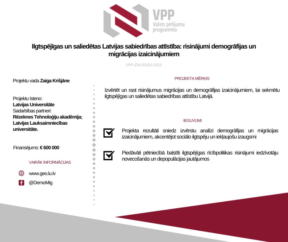 Projekta mērķis ir izvērtēt un rast risinājumus migrācijas un demogrāfijas izaicinājumiem, lai sekmētu ilgtspējīgas un saliedētas sabiedrības attīstību Latvijā. Projektā tiks izmantota inovatīva starpdisciplinārā pieeja, lietojot kvantitatīvo, kvalitatīvo un eksperimentālo metožu triangulāciju un līdzdalības pieeju zināšanu radīšanā. Pētījums sniegs datos balstītu analīzi, aplūkojot migrācijas daudzveidīgo ietekmi uz demogrāfiskajām pārmaiņām un reģionālajām atšķirībām. Īpaša uzmanība tiks pievērsta talantu un augsti kvalificētu profesionāļu migrācijas ietekmei uz cilvēkkapitālu, tai skaitā vērtējot izglītības institūciju lomu cilvēku kapitāla piesaistē un noturēšanā. Tāpat tiks analizēta kultūras nozīme reģionu revitalizācijā. Projekta rezultāti sniegs izvērstu analīzi demogrāfijas un migrācijas izaicinājumiem, akcentējot sociālo ilgtspēju un iekļaujošu izaugsmi. Izvērtējot demogrāfisko un migrācijas procesu daudzveidību, tiks piedāvāti pētniecībā balstīti ilgtspējīgas rīcībpolitikas risinājumi iedzīvotāju novecošanās un depopulācijas jautājumos.