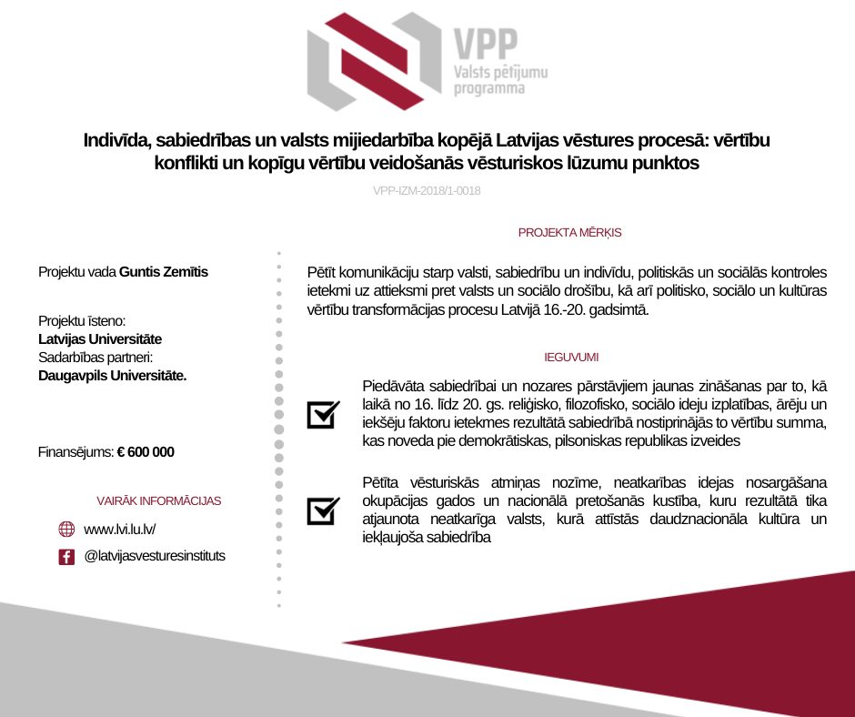 100 gadus pēc valsts dibināšanas ir aktuāli apzināt un novērtēt tās vērtības un vēsturiskos pagrieziena punktus, kas deva iespēju nodibināt demokrātisku Latvijas Republiku. Valsts tapšanas brīdī pastāvēja vairākas Latvijas valstiskuma alternatīvas. Vēsturnieku, sociologu, juristu un teologu starpdisciplināra, kvalificētu zinātnieku komanda, piesaistot studentus, veiks jaunākās historiogrāfijas apzināšanu un avotu izpēti ar mērķi piedāvāt sabiedrībai un nozares pārstāvjiem jaunas zināšanas par to, kā laikā no 16. līdz 20. gs. reliģisko, filozofisko, sociālo ideju izplatības, ārēju un iekšēju faktoru ietekmes rezultātā sabiedrībā nostiprinājās to vērtību summa, kas noveda pie demokrātiskas, pilsoniskas republikas izveides. Tiks pētīta vēsturiskās atmiņas nozīme, neatkarības idejas nosargāšana okupācijas gados un nacionālā pretošanās kustība, kuru rezultātā tika atjaunota neatkarīga valsts, kurā attīstās daudznacionāla kultūra un iekļaujoša sabiedrība. Īpaša uzmanība tiks pievērsta dažādu etnisku, sociālu un reliģisku grupu devumam Latvijas valstiskuma un kultūras daudzveidības izveidē un saglabāšanā. Pētnieku uzmanības lokā būs arī sabiedrības drošības nodrošinājums, tā kompleksā daba, indivīda pārliecības loma valsts drošības stiprināšanā.