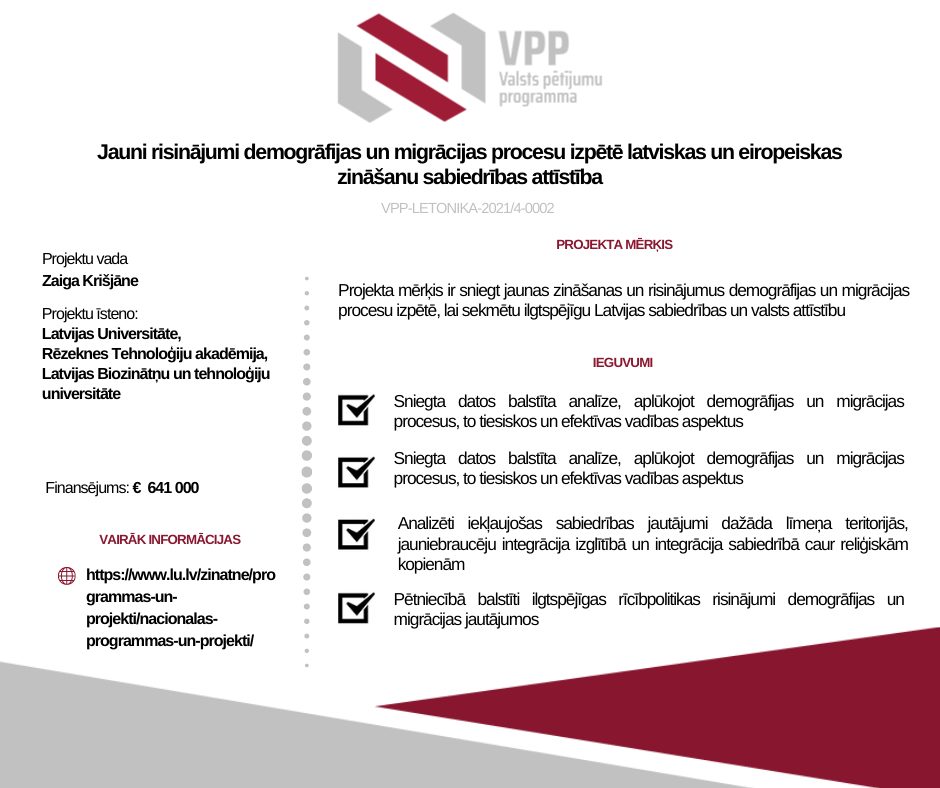 Pētījuma mērķis ir sniegt jaunas zināšanas un risinājumus demogrāfijas un migrācijas procesu izpētē, lai sekmētu ilgtspējīgu Latvijas sabiedrības un valsts attīstību. Projektā tiks izmantota inovatīva starpdisciplinārā un koprades pieeja, lietojot kvantitatīvo un kvalitatīvo metožu triangulāciju jaunu zināšanu radīšanā. Pētījums sniegs datos balstītu analīzi, aplūkojot demogrāfijas un migrācijas procesos, to tiesiskos un efektīvas vadības aspektus. Tāpat tiks akcentēta remigrācija un diasporas sadarbības tīkli, kā arī talantīgu speciālistu migrācija un to ietekme uz cilvēkkapitālu. Tiks analizēti iekļaujošas sabiedrības jautājumi dažāda līmeņa teritorijās, jauniebraucēju integrācija izglītībā un integrācija sabiedrībā caur reliģiskām kopienām. Projekta rezultāti sniegs izvērstu analīzi par demogrāfijas un migrācijas procesiem, akcentējot sabiedrības ilgtspēju un iekļaujošu attīstību. Izvērtējot mūsdienu demogrāfisko un migrācijas procesu daudzveidību, tiks piedāvāti pētniecībā balstīti ilgtspējīgas rīcībpolitikas risinājumi demogrāfijas un migrācijas jautājumos. Iegūtie rezultāti sekmēs iekļaujošas zināšanu sabiedrības attīstību Latvijā.