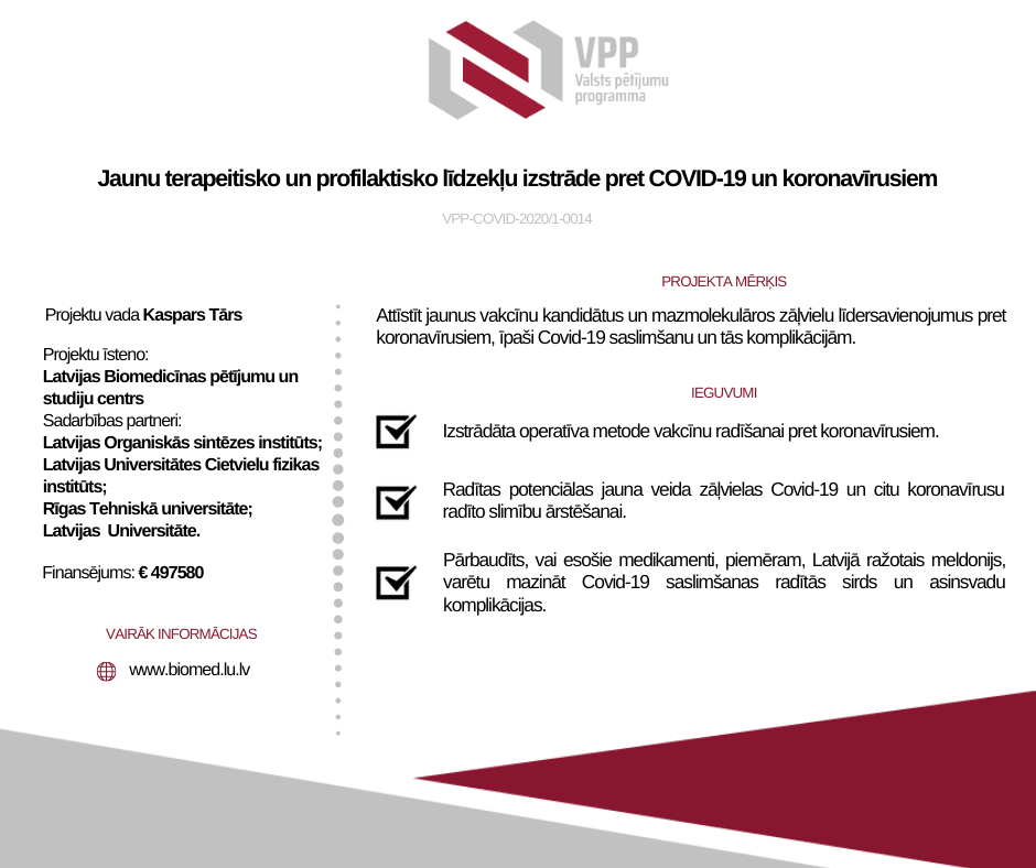 Projekta mērķis ir attīstīt jaunus vakcīnu kandidātus un mazmolekulāros zāļvielu līdersavienojumus pret koronavīrusiem, īpaši COVID-19 saslimšanu un tās komplikācijām. Mērķa sasniegšanai mēs esam izvirzījuši četrus uzdevumus. Pirmkārt, mēs izveidosim platformu zāļvielu un vakcīnu kandidātu testēšanai. Platformā ietilps BSL-3 savietojamu manipulāciju ar SARS-CoV-2 ieviešana, pseidovirionu testi un orgāna-uz-čipa tehnoloģijas attīstīšana. Otrkārt, mēs plānojam atklāt jaunus pretvīrusu mazmolekulāros līdersavienojumus, vērstus pret divām SARS-CoV-2 mRNS kepa metiltransferāzēm. Treškārt, mēs izveidosim modulāru ātrās atbildes pret-koronavīrusu vakcīnu izstrādes sistēmu izmantojot S proteīna RBD domēna un vīrusveidīgo daļiņu biokonjugāciju. Ceturtkārt, mēs izpētīsim uz mitohondrijiem mērķēto zāļvielu translācijas potenciālu inducētu plaušu un kardiovaskulāro komplikāciju mazināšanai.