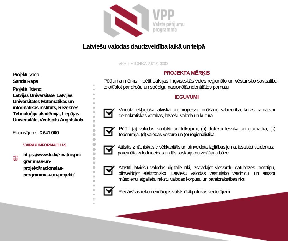 Projekta mērķis ir pētīt Latvijas lingvistiskās vides reģionālo un vēsturisko savpatību, to attīstot par drošu un spēcīgu nacionālās identitātes pamatu. Lai to sasniegtu, tiks studētas piecas latviešu valodas dimensijas: dialekti, valodas paveidi, īpašvārdi (vietvārdi), vēsture un valodu kontakti. Tas sasaucas ar programmas virsmērķi: veidot iekļaujošu latvisku un eiropeisku zināšanu sabiedrību, kuras pamats ir demokrātiskās vērtības, latviešu valoda un kultūra. Valsts pētījumu programmas projekts tiks īstenots piecos virzienos, kuru uzdevumi noteikti Ministru kabineta 07.07.2021. rīkojumā Nr. 475. Projektu veidos pieci apakšprojekti, kuros pētīs (a) valodas kontaktus un tulkojumus, (b) dialektu leksiku un gramatiku, (c) toponīmiju, (d) valodas vēsturi un (e) reģionālistiku. Projekts vienlaikus īstenos programmas horizontālos uzdevumus: attīstīs zinātnisko cilvēkkapitālu un pilnveidos izglītības jomu, iesaistot studentus; palielinās valodniecības un tās saskarjomu zināšanu bāzi, sagatavojot četras zinātniskas monogrāfijas onomastikā, tulkojumzinātnē un dialektoloģijā un iesniedzot rakstus starptautiski indeksētās datubāzēs; attīstīs latviešu valodas digitālos rīkus, izstrādājot vietvārdu datubāzes prototipu, pilnveidojot elektronisko „Latviešu valodas vēsturisko vārdnīcu” un attīstot mūsdienu latgaliešu rakstu valodas korpusu un pareizrakstības rīku, piedāvās rekomendācijas valsts rīcībpolitikas veidotājiem un informēs sabiedrību par sasniegtajiem rezultātiem.