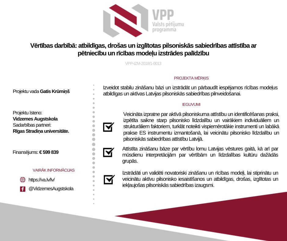 Projekta mērķis ir izveidot stabilu zināšanu bāzi un izstrādāt un pārbaudīt iespējamos rīcības modeļus atbildīgas un aktīvas Latvijas pilsoniskās sabiedrības pilnveidošanai. Projekta ietvaros tiks veikta padziļināta izpēte par Latvijas valsts vērtībām, valsts institūciju pārvaldes darbības jomām, vērtību attīstību Latvijas teritorijā vēstures gaitā. Projekta komanda apskatīs jautājumu par demokrātisko vērtību svarīgumu, valsts tiesībām un to attīstību ietekmējošiem faktoriem. Īpaša uzmanība tiks pievērsta Eiropas Savienības pārvaldības struktūrām un politikām saistībā ar pilsoniskās sabiedrības attīstības tematu, kā arī sabiedrības tiesībām. Atbildības un sadarbības mehānismi valsts vispārējās attīstības procesā un veidi, kā sabiedrības vērtības ietekmē tās rīcību, tiks pētīti gan makro, gan mikro līmenī, koncentrējoties, pirmkārt, uz strukturālajām ietekmēm un, otrkārt, uz personu pozicionēšanos un rīcību. Projekts tiks īstenots ciešā sadarbībā starp divām zinātniskajām institūcijām: Vidzemes Augstskolu (vadošais partneris) un Rīgas Stradiņa universitāte (partneri). Projekta galvenie rezultāti būs divas monogrāfijas, vairākas zinātniskās publikācijas akadēmiskajos žurnālos – balstoties uz pētījuma rezultātiem,tiks izstrādāti un pārbaudīti potenciālie rīcības modeļi pilsoniskās sabiedrības attīstībai Latvijā.